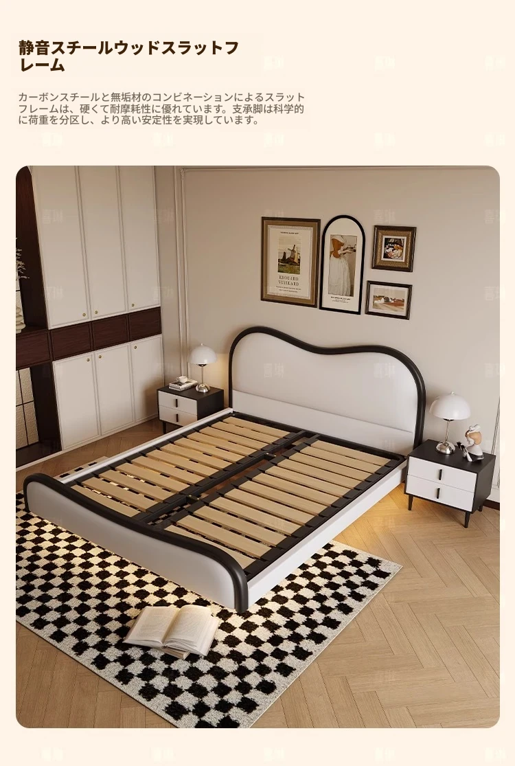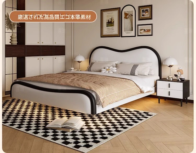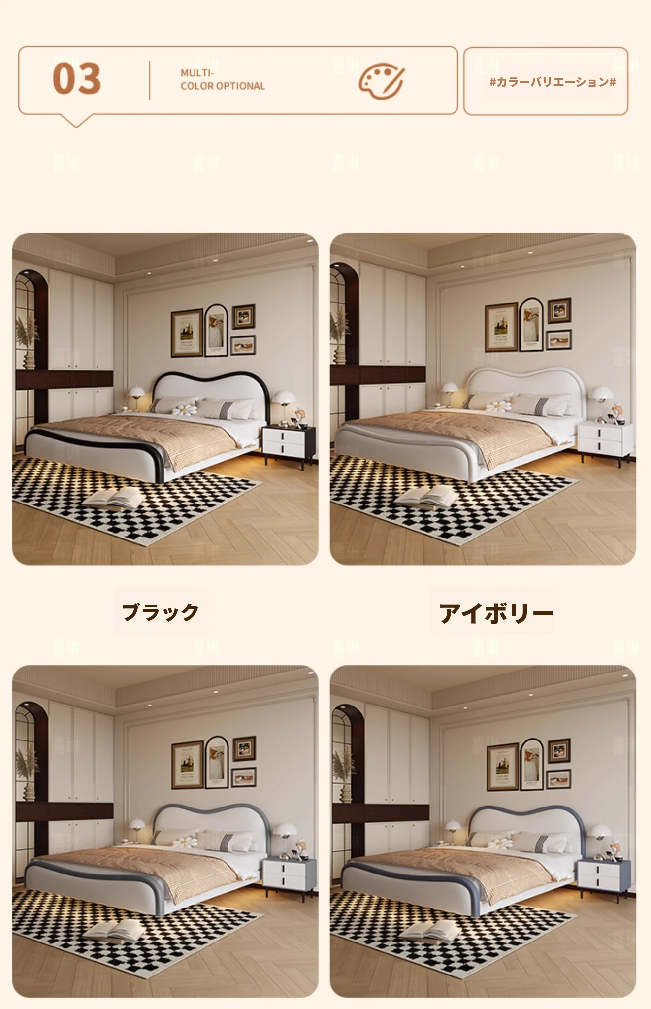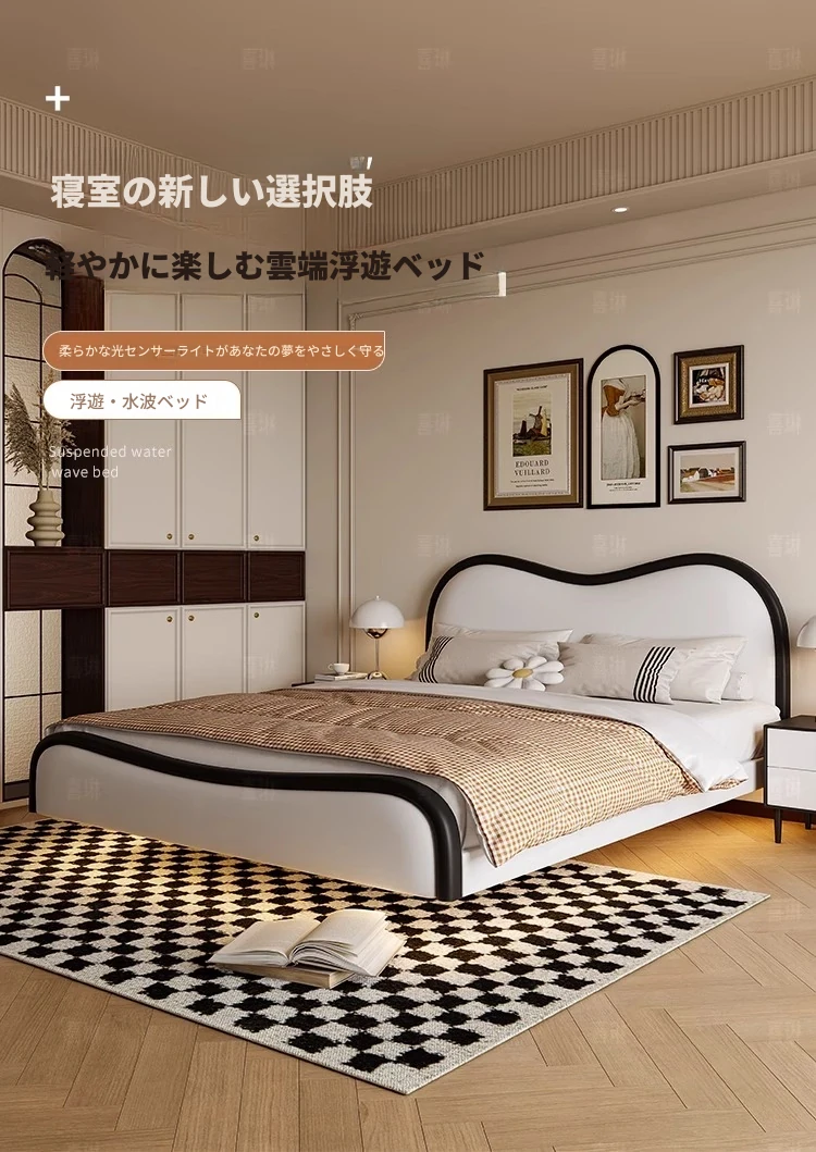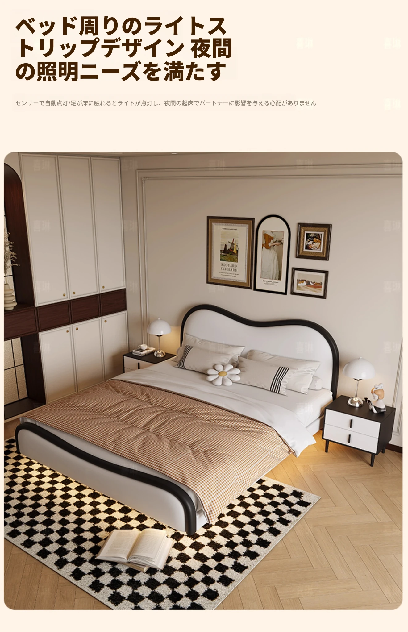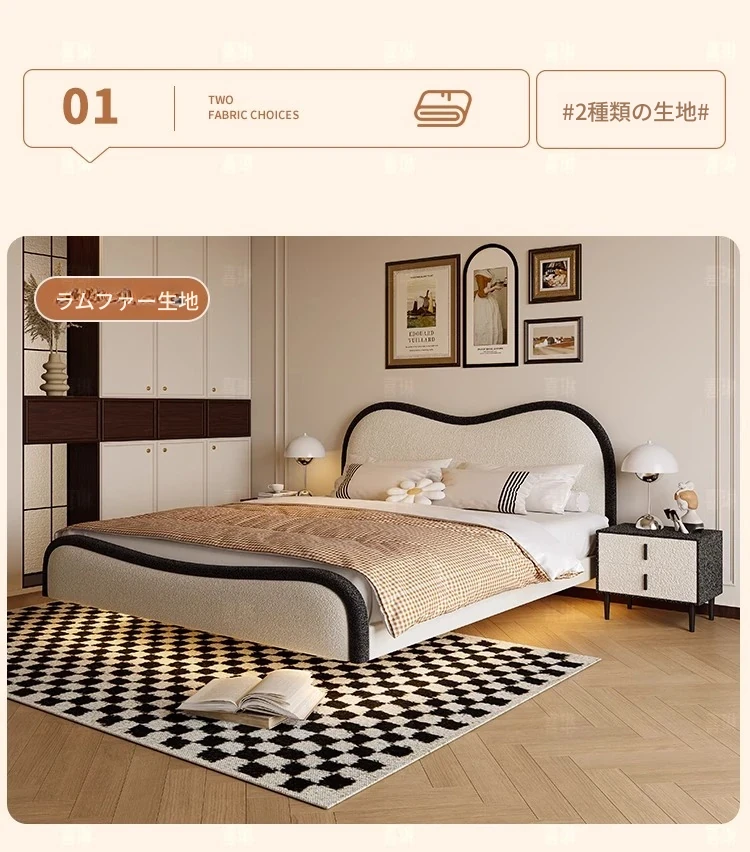 フレンチクリーム風プリンセスベッド|モダンな黒白コンビネーションのウェーブデザイン|イタリアンミニマル真皮使用|ふわふわテディベルベット|女の子にぴったりな夢の婚礼ベッド!